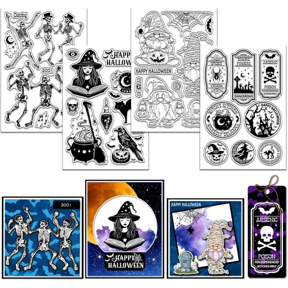 4 Sheets Halloween Witch Clear Stamp for Scrapbooking Skeleton Gnome Silicone Stamps Magical Transparent Stamp Set for Card
