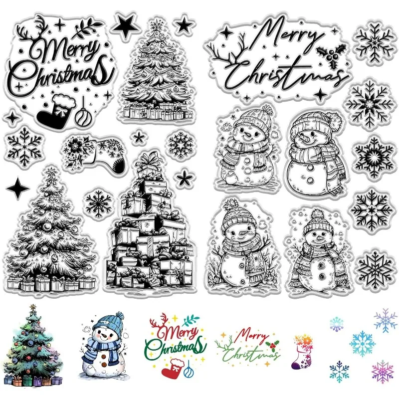 1Set 2 Sheets Merry Christmas Clear Rubber Stamps Snowman Snowflake Xmas Tree Greeting Words Gift Reusable Vintage Transparent