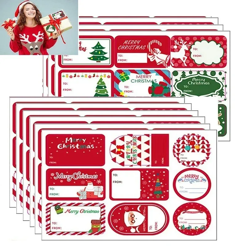10 Sheets Christmas Tags 8 Design Gift Sticker Name Tag with Santa Snowmen Xmas Tree Reindeer Bells Holiday Decorative Tag